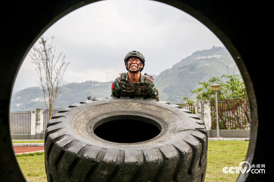 武警特戰(zhàn)隊(duì)員進(jìn)行翻輪胎力量訓(xùn)練。