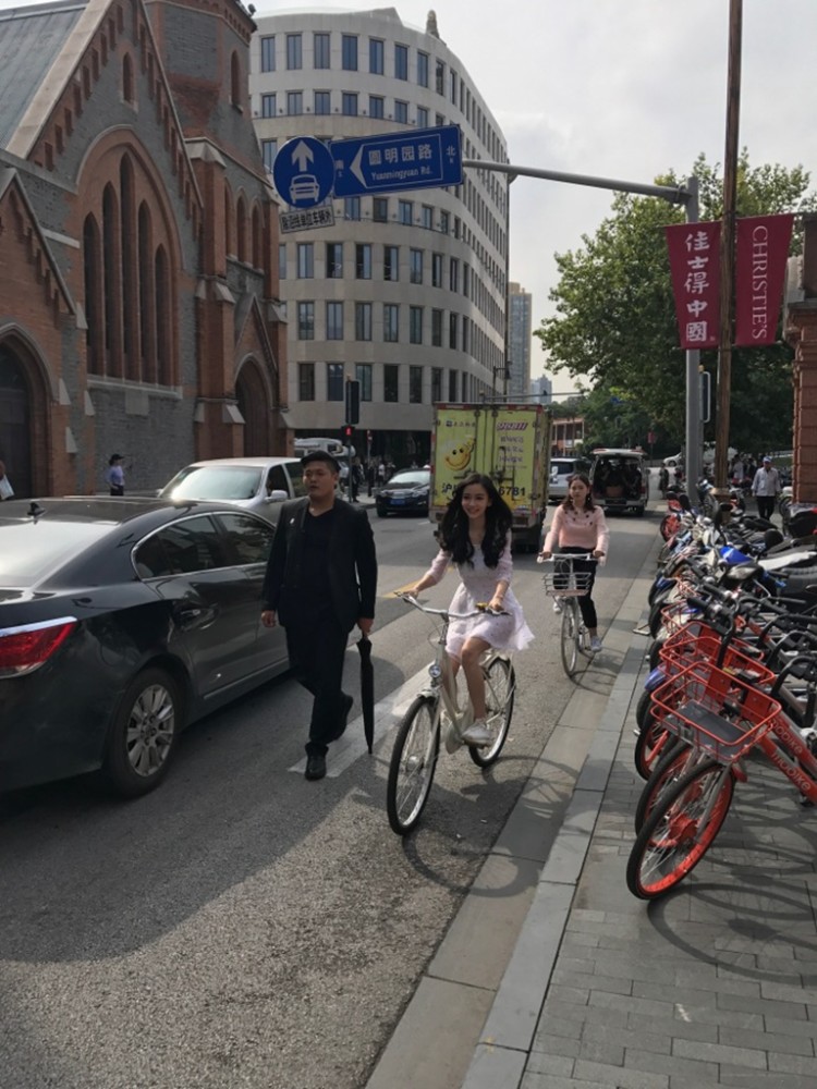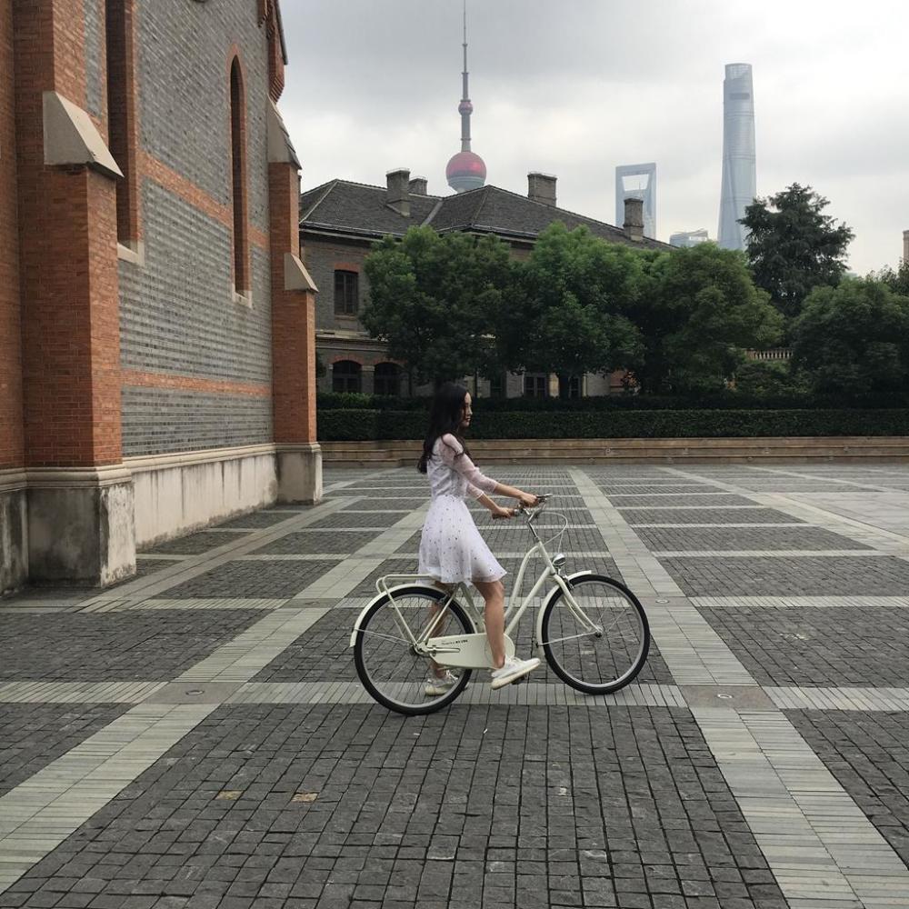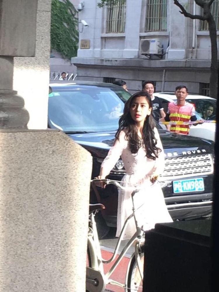 Angelababy騎自行車現(xiàn)身上海。