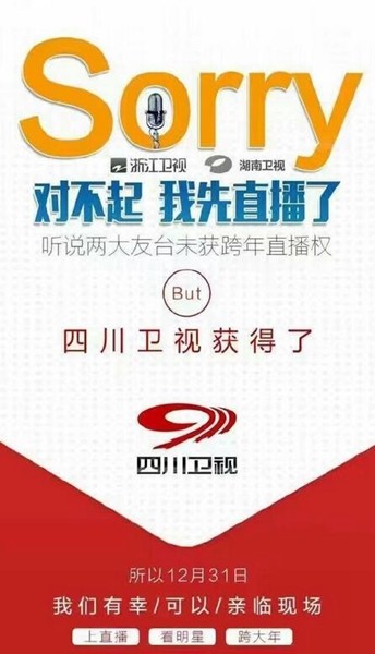 沒有了老大老二,31日的跨年會是什么情況?從當(dāng)天的收視率來看,拿到牌照的江蘇、東方等臺的收視率會更樂觀,這是毋庸置疑的。尤其湖南、浙江沒有拿到牌照的消息剛剛放出的時候,東方就宣布中插廣告漲價,將賣到45萬一條。而作為三線衛(wèi)視的四川衛(wèi)視,也算在這一次跨年戰(zhàn)中揚(yáng)眉吐氣了一次。