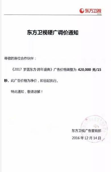 對于31號當(dāng)天拿到跨年牌照的幾家衛(wèi)視來講,也是機(jī)遇和挑戰(zhàn)并存。而對于東方衛(wèi)視廣告漲價一事,大家也心照不宣地表示,其宣傳作用大于實際價值。“在圈內(nèi),大家都知道了這條信息的傳播。其實目的已經(jīng)達(dá)到了,至于能賣不賣得到45萬一條中插,這個其實不重要了。”