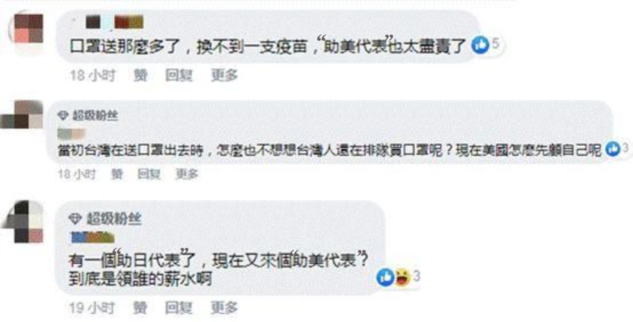 國民黨籍前民代孫大千曾質(zhì)疑稱,美國讓臺灣花大錢買軍火,又逼臺灣吞下“萊豬”(含瘦肉精美豬),為什么不能協(xié)助臺灣取得疫苗,讓醫(yī)護人員優(yōu)先打?去年全球急需口罩的時刻,臺灣捐出大量口罩,民進黨當局整天吹噓Taiwan can help(臺灣能幫忙),但是現(xiàn)在當Taiwan needs help(臺灣需要幫忙)的時候,為什么No one can help(沒人幫忙)呢?臺灣竟然淪落到要用“芯片換疫苗”。