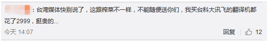 這個消息傳到大陸后,有微博網(wǎng)友調(diào)侃稱,“這跟榨菜不一樣,不能隨便送你們”,“挺貴的”。