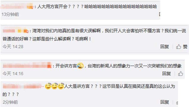 還有網(wǎng)友對于邱敏寬提到的“人大講方言”吐槽表示,“我們開人大會害怕聽不懂方言?我們統(tǒng)一說普通話的好嘛?”還有人調(diào)侃,“這節(jié)目是認(rèn)真在搞笑還是真的這么認(rèn)為的???”