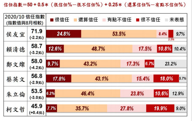 信任指數(shù)最高為新北市長侯友宜比2020年8月調(diào)查減少2.2點(diǎn)達(dá)71.9點(diǎn),78.3%信任、11.9%不信任?! ?/p>