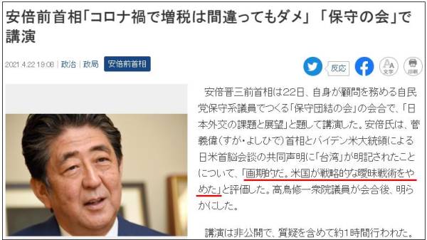 據(jù)日本《產(chǎn)經(jīng)新聞》4月22日報道,在當天自民黨保守派成員組成的“保守團結(jié)之會”上,日本前首相安倍晉三發(fā)表了關(guān)于日本外交問題和前景的演講,安倍表示:美國一改往日(對臺灣海峽的)“戰(zhàn)略模糊”態(tài)度,這是劃時代的。