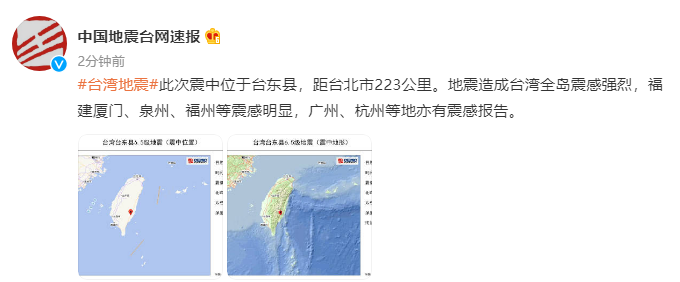 臺灣中時(shí)新聞網(wǎng)報(bào)道稱,此次地震屬于淺層地震,加上震中在內(nèi)陸,全臺皆有震感。