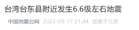 據(jù)中國地震臺網(wǎng)自動測定:2022年9月17日21時(shí)41分在臺灣臺東縣(北緯23.23度,東經(jīng)121.06度)發(fā)生6.6級左右地震,最終結(jié)果以正式速報(bào)為準(zhǔn)。