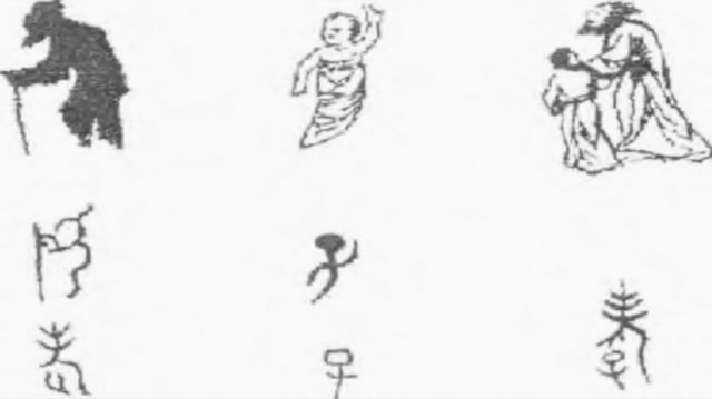 請(qǐng)大家看這樣一幅圖,那第一個(gè),一個(gè)老人拄著拐杖行走,象形之后形成了甲骨文中的一個(gè)“老”字。