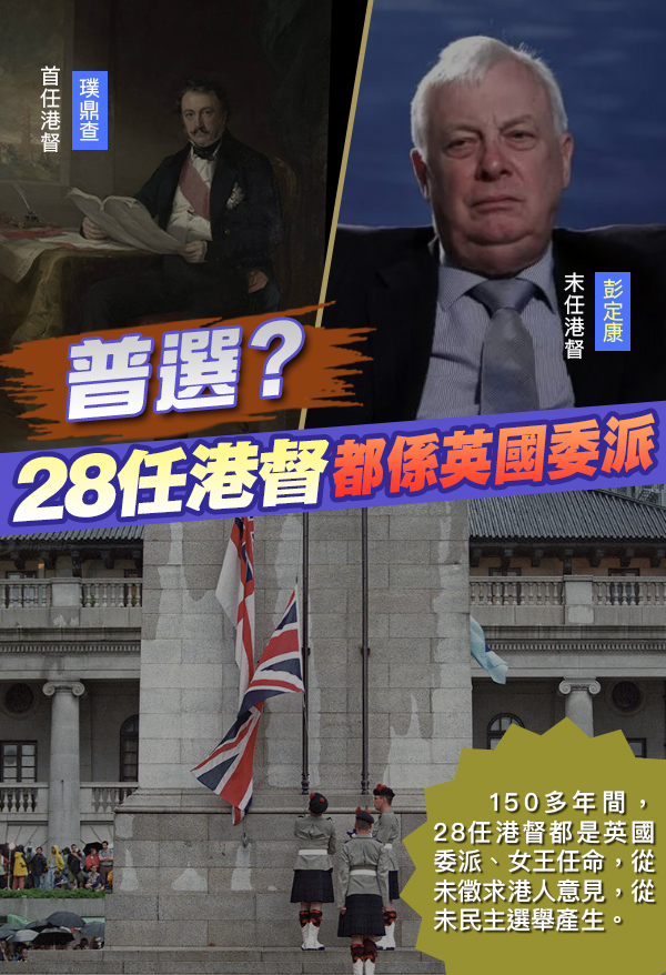 英國自1841年占領(lǐng)香港后,實行高度集權(quán)的政治體制,由英女王任命的港督集行政、立法、軍事大權(quán)于一身。從首任港督璞鼎查,到末任港督彭定康,155年間,28任港督從未征求港人意見,從未經(jīng)過民主選舉產(chǎn)生,港督無須向香港民眾負(fù)責(zé)。