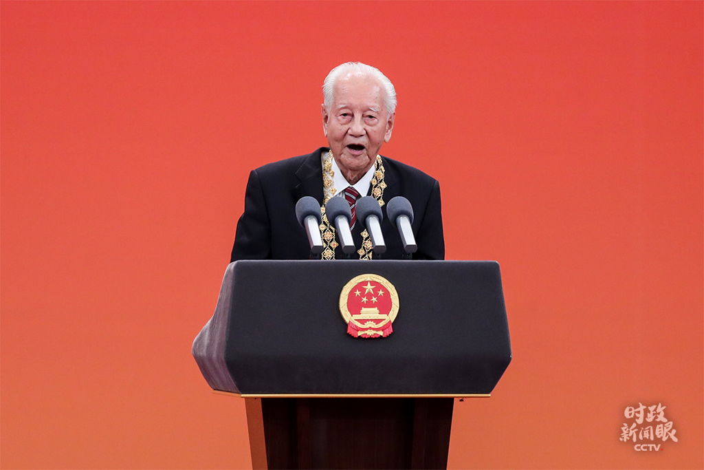 △“共和國勛章”獲得者黃旭華當(dāng)天代表“共和國勛章”和國家榮譽(yù)稱號(hào)獲得者發(fā)言。他和習(xí)近平都提到了這一句話:做隱姓埋名人、干驚天動(dòng)地事。(國廣記者沈湜拍攝)