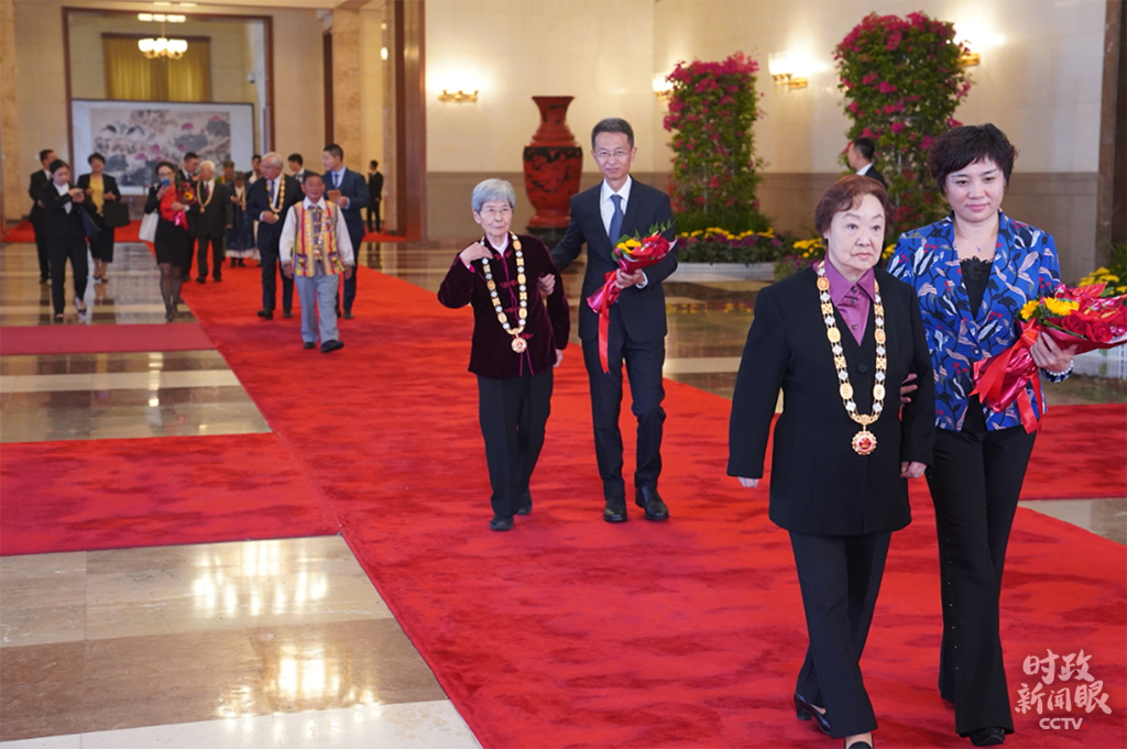 △頒授儀式后,習(xí)近平等領(lǐng)導(dǎo)同志同大家合影留念。這是國家勛章和國家榮譽(yù)稱號(hào)獲得者在合影結(jié)束后準(zhǔn)備離開大會(huì)堂。