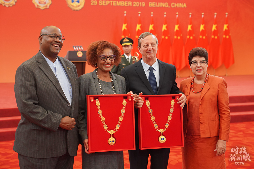 △兩位“友誼勛章”獲得者——勞爾•卡斯特羅•魯斯(古巴)、薩利姆•艾哈邁德•薩利姆(坦桑尼亞)當(dāng)天沒有到場,他們的勛章分別由古巴駐華大使拉米雷斯(右二)和薩利姆女兒瑪亞姆•薩利姆(左二)代領(lǐng)。這是他們在會(huì)場與人合影。