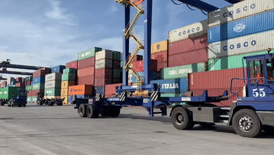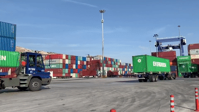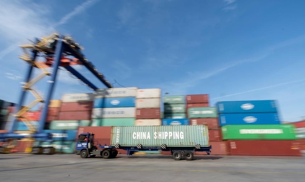 一輛輛集裝箱式半掛車、碼頭叉車穿梭往來,有條不紊地裝卸貨物?,F(xiàn)代化的比雷埃夫斯集裝箱碼頭繁忙有序。