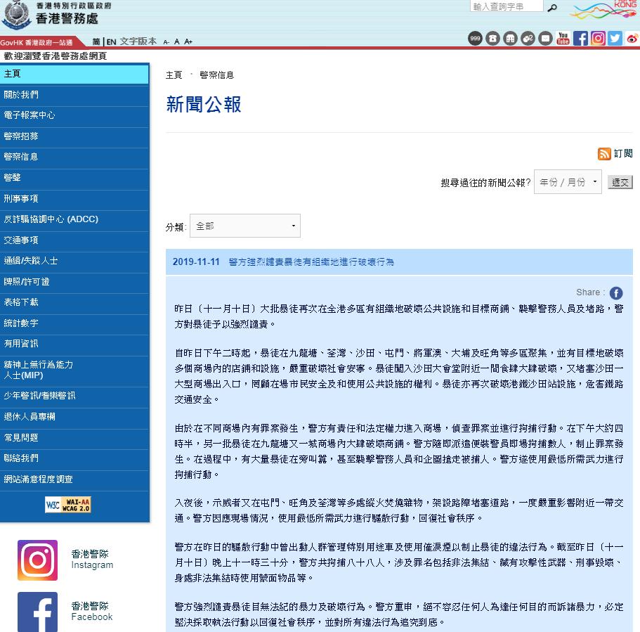 昨日(11月10日)大批暴徒再次在全港多區(qū)有組織地破壞公共設(shè)施和目標(biāo)商鋪、襲擊警務(wù)人員及堵路,警方對(duì)暴徒予以強(qiáng)烈譴責(zé)。