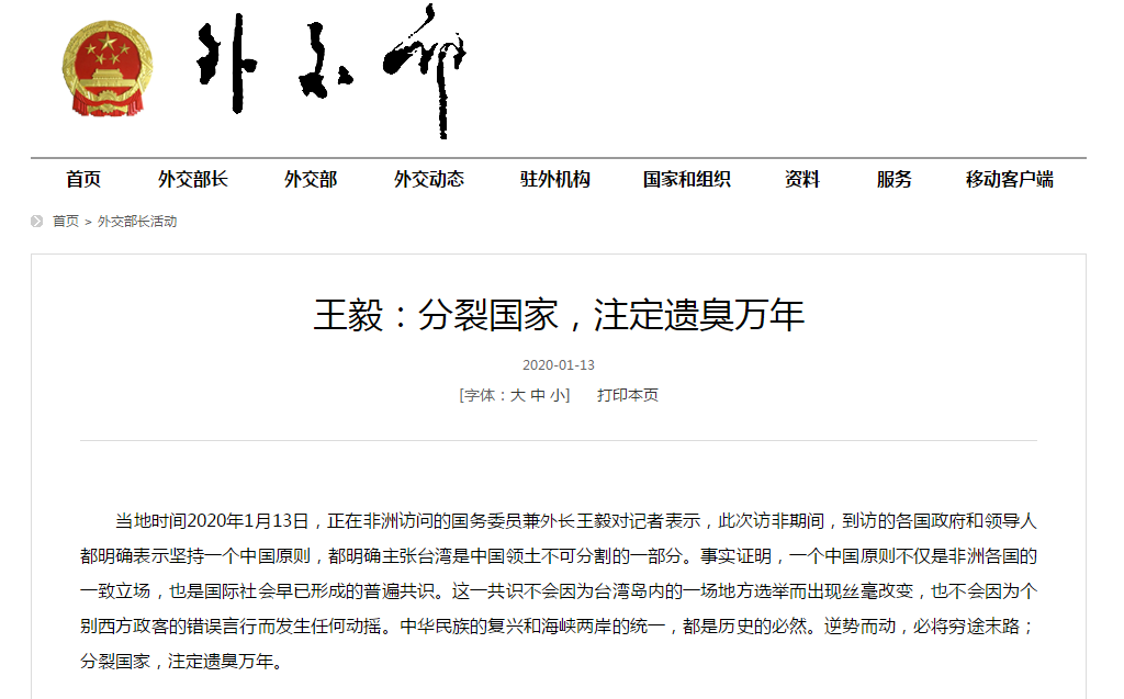 當(dāng)?shù)貢r(shí)間2020年1月13日,正在非洲訪問(wèn)的國(guó)務(wù)委員兼外長(zhǎng)王毅對(duì)記者表示,此次訪非期間,到訪的各國(guó)政府和領(lǐng)導(dǎo)人都明確表示堅(jiān)持一個(gè)中國(guó)原則,都明確主張臺(tái)灣是中國(guó)領(lǐng)土不可分割的一部分。事實(shí)證明,一個(gè)中國(guó)原則不僅是非洲各國(guó)的一致立場(chǎng),也是國(guó)際社會(huì)早已形成的普遍共識(shí)。這一共識(shí)不會(huì)因?yàn)榕_(tái)灣島內(nèi)的一場(chǎng)地方選舉而出現(xiàn)絲毫改變,也不會(huì)因?yàn)閭€(gè)別西方政客的錯(cuò)誤言行而發(fā)生任何動(dòng)搖。中華民族的復(fù)興和海峽兩岸的統(tǒng)一,都是歷史的必然。逆勢(shì)而動(dòng),必將窮途末路;分裂國(guó)家,注定遺臭萬(wàn)年。
