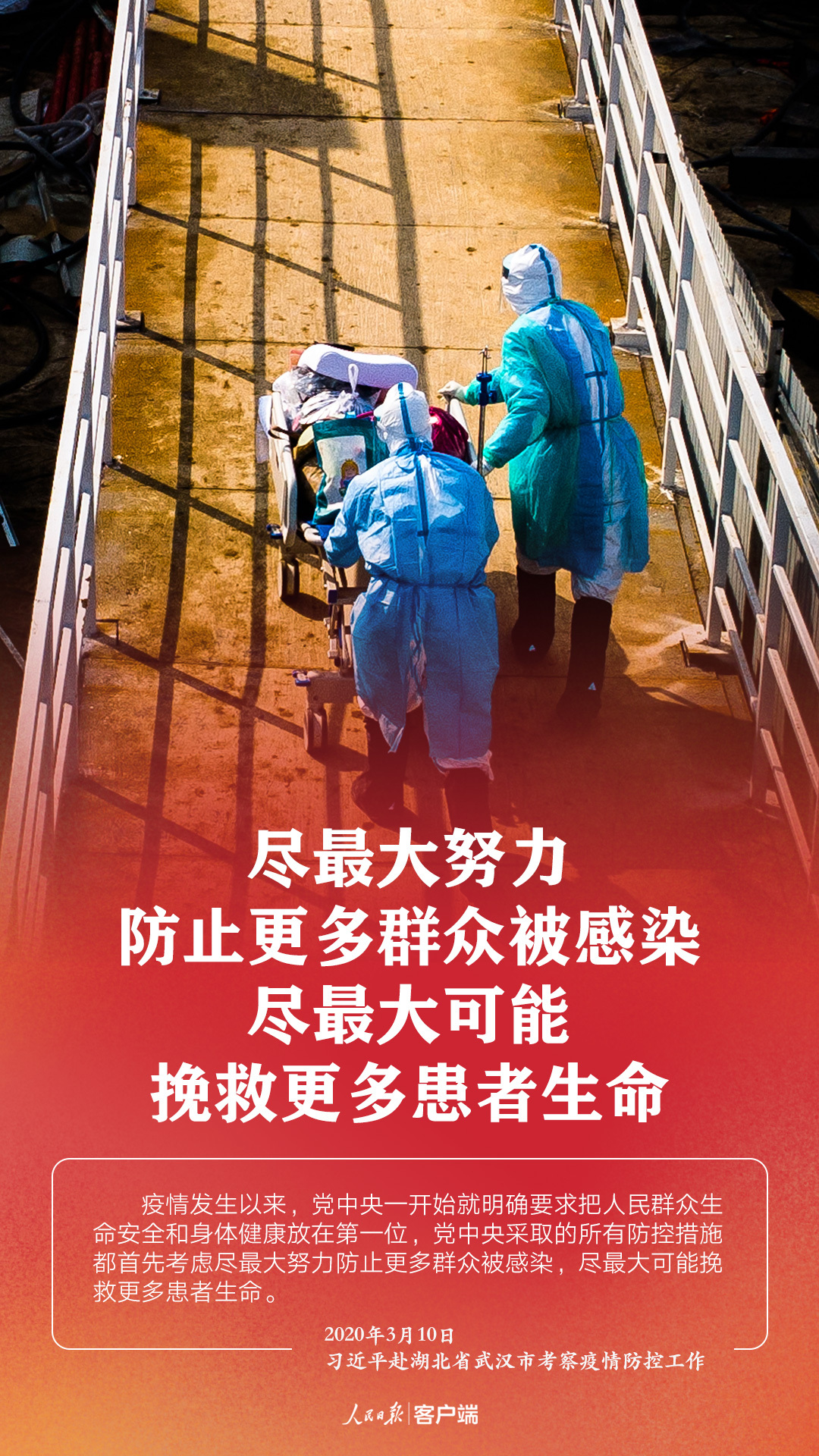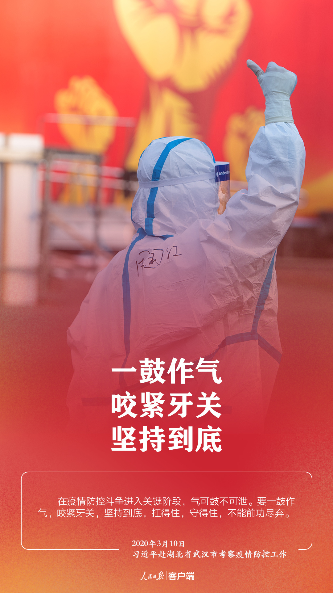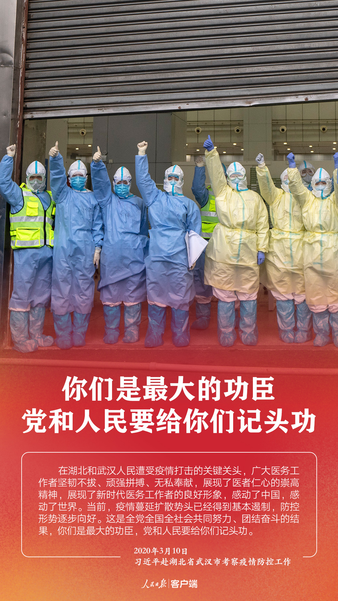 3月10日,在抗擊新冠肺炎疫情的關(guān)鍵時(shí)刻,習(xí)近平總書記專門赴湖北省武漢市考察疫情防控工作。他強(qiáng)調(diào),湖北和武漢是這次疫情防控斗爭(zhēng)的重中之重和決勝之地。在這場(chǎng)嚴(yán)峻斗爭(zhēng)中,湖北各級(jí)黨組織和廣大黨員、干部沖鋒在前、英勇奮戰(zhàn),全省醫(yī)務(wù)工作者和援鄂醫(yī)療隊(duì)員白衣執(zhí)甲、逆行出征,人民解放軍指戰(zhàn)員聞令即動(dòng)、勇挑重?fù)?dān),廣大社區(qū)工作者、公安干警、基層干部、下沉干部...