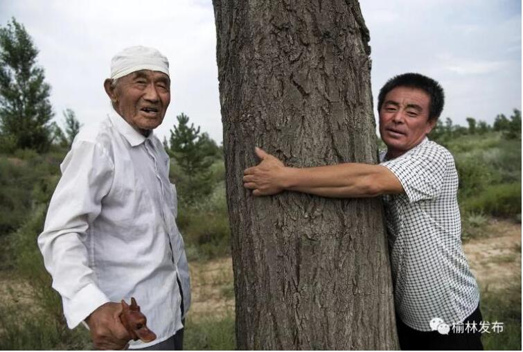 陜西榆林市靖邊縣東坑鎮(zhèn)毛團(tuán)村年逾九旬的郭成旺(左)的孫兒郭建軍抱著老人1984年栽下的一棵樹,當(dāng)年的樹苗現(xiàn)已長(zhǎng)成參天大樹