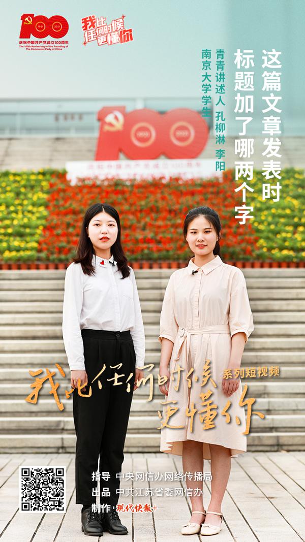 未來屬于青年,希望寄予青年。由中央網(wǎng)信辦網(wǎng)絡(luò)傳播局指導(dǎo)、中共江蘇省委網(wǎng)信辦出品、現(xiàn)代快報(bào) + 制作的 " 我比任何時(shí)候更懂你 " 系列短視頻燃情上線。現(xiàn)代快報(bào)聯(lián)合全國 30 所高校、30 個(gè)青青講述人團(tuán)隊(duì),奔赴全國 21 個(gè)城市,走進(jìn)全國 26 家紅色場館,行程 12000 多公里,講述 30 個(gè)黨史故事。" 我比任何時(shí)候更懂你 ",這是最青春的追尋和響應(yīng),這是青年人對百年大黨最深情的告白!
