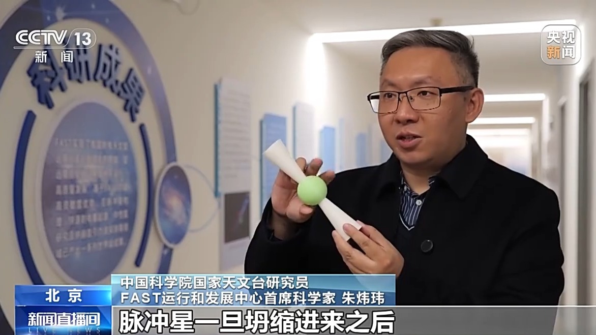 中國(guó)科學(xué)院國(guó)家天文臺(tái)研究員 FAST運(yùn)行和發(fā)展中心首席科學(xué)家 朱煒瑋:比方說(shuō),這是一個(gè)脈沖星模型,脈沖星一旦坍縮進(jìn)來(lái)之后,它的質(zhì)量仍然有比太陽(yáng)還大的質(zhì)量,但它的半徑只有10公里左右。它有巨大的密度,它的密度之大、壓力之大,它的核心的密度已經(jīng)超過(guò)了核物質(zhì),可以說(shuō)是把原子核已經(jīng)壓碎了,所以在這么一種極端的天體里面,我們通過(guò)研究它,就可以幫助我們理解在極高密度下粒子物理的基本。它是宇宙中極為獨(dú)特的天體物理“實(shí)驗(yàn)室”。