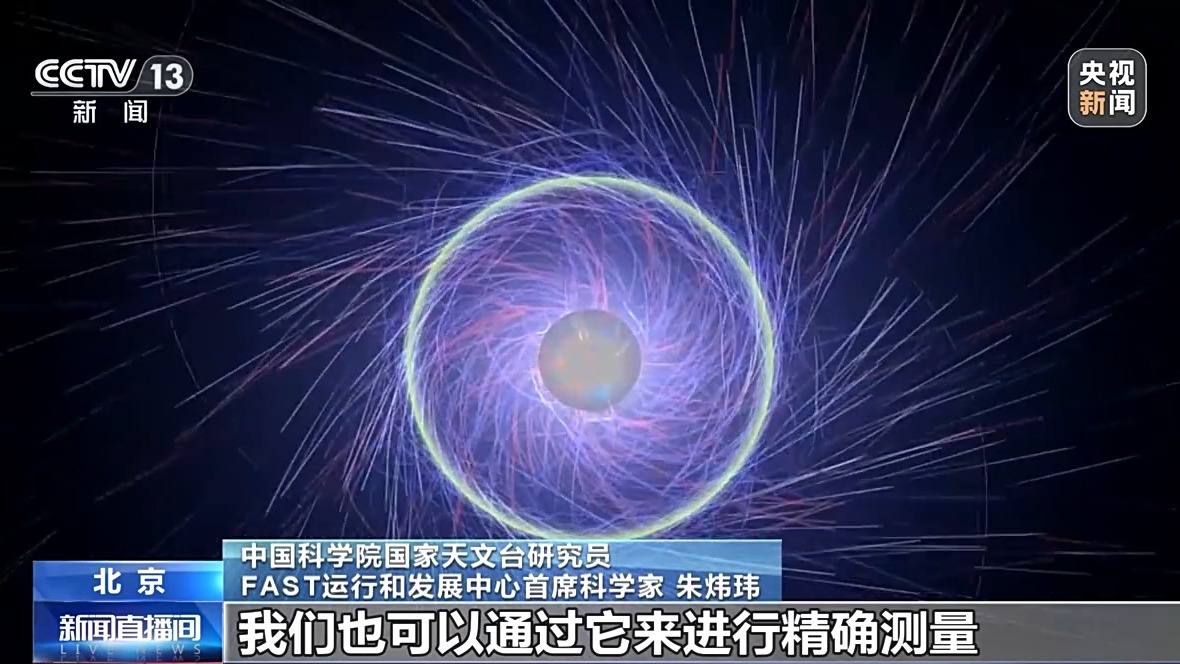 中國(guó)科學(xué)院國(guó)家天文臺(tái)研究員 FAST運(yùn)行和發(fā)展中心首席科學(xué)家 朱煒瑋:我們可以去研究各種引力效應(yīng)、粒子物理。我們也可以通過(guò)它來(lái)進(jìn)行精確測(cè)量。有些脈沖星轉(zhuǎn)得非???,最快的脈沖星,它一秒鐘就能轉(zhuǎn)七百多次,它是宇宙中非常精準(zhǔn)的一種“時(shí)鐘”。通過(guò)測(cè)量它們,我們可以建立更好的時(shí)間基準(zhǔn),可以用來(lái)導(dǎo)航,這也是可能未來(lái)能夠在我們的實(shí)際生活中有所用處的地方。
