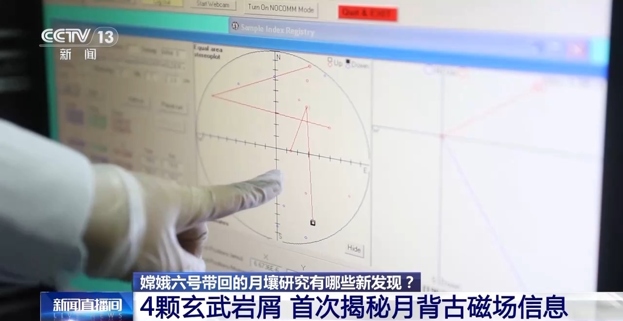 中國科學院地質與地球物理研究所副研究員 蔡書慧:我們挑出來的4顆毫米級的玄武巖巖屑的研究,發(fā)現(xiàn)月球在距今28億年的時候具有一個磁場,而且它的磁場有增強的趨勢。