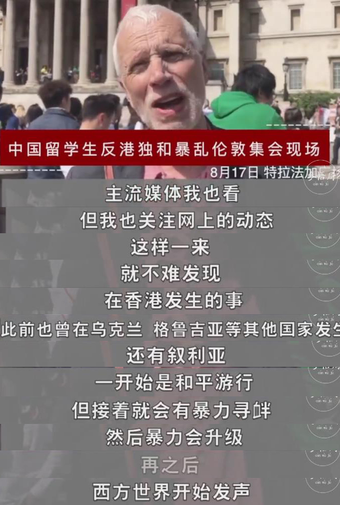 當(dāng)?shù)貢r(shí)間17日,在中國留學(xué)生反港獨(dú)和反暴亂倫敦集會(huì)現(xiàn)場,偶然經(jīng)過此地的英國學(xué)者喬治·哈拉姆談及他感受到的香港騷亂時(shí)表示,支持中國留學(xué)生的訴求。