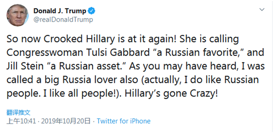 特朗普當(dāng)?shù)貢r(shí)間19日發(fā)推稱(chēng),“所以現(xiàn)在騙子希拉里又來(lái)了!她說(shuō)國(guó)會(huì)議員圖爾西·加巴德是‘俄羅斯的寵兒’,吉爾·斯坦(綠黨前總統(tǒng)候選人)是‘俄羅斯的線人’。你們可能已經(jīng)聽(tīng)說(shuō)了,我也被稱(chēng)作是俄羅斯的情人(實(shí)際上,我確實(shí)喜歡俄羅斯人。我喜歡所有人!)。”說(shuō)完這些,特朗普炮轟說(shuō),“希拉里瘋了!”