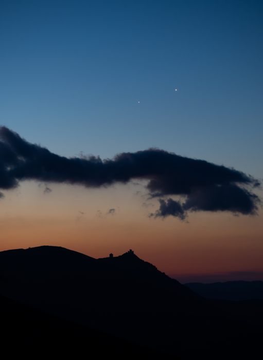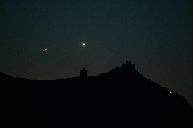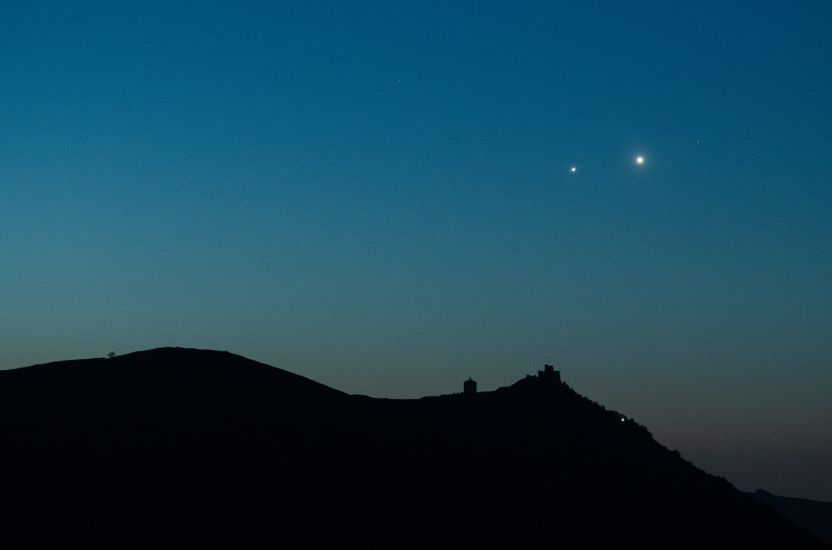5月1日黎明時(shí)分,最亮的兩顆行星——金星與木星將近距離相合,上演“超親密一刻”。4月30日凌晨,一名攝影師在意大利拍攝下兩顆行星近距離相合前的畫(huà)面。