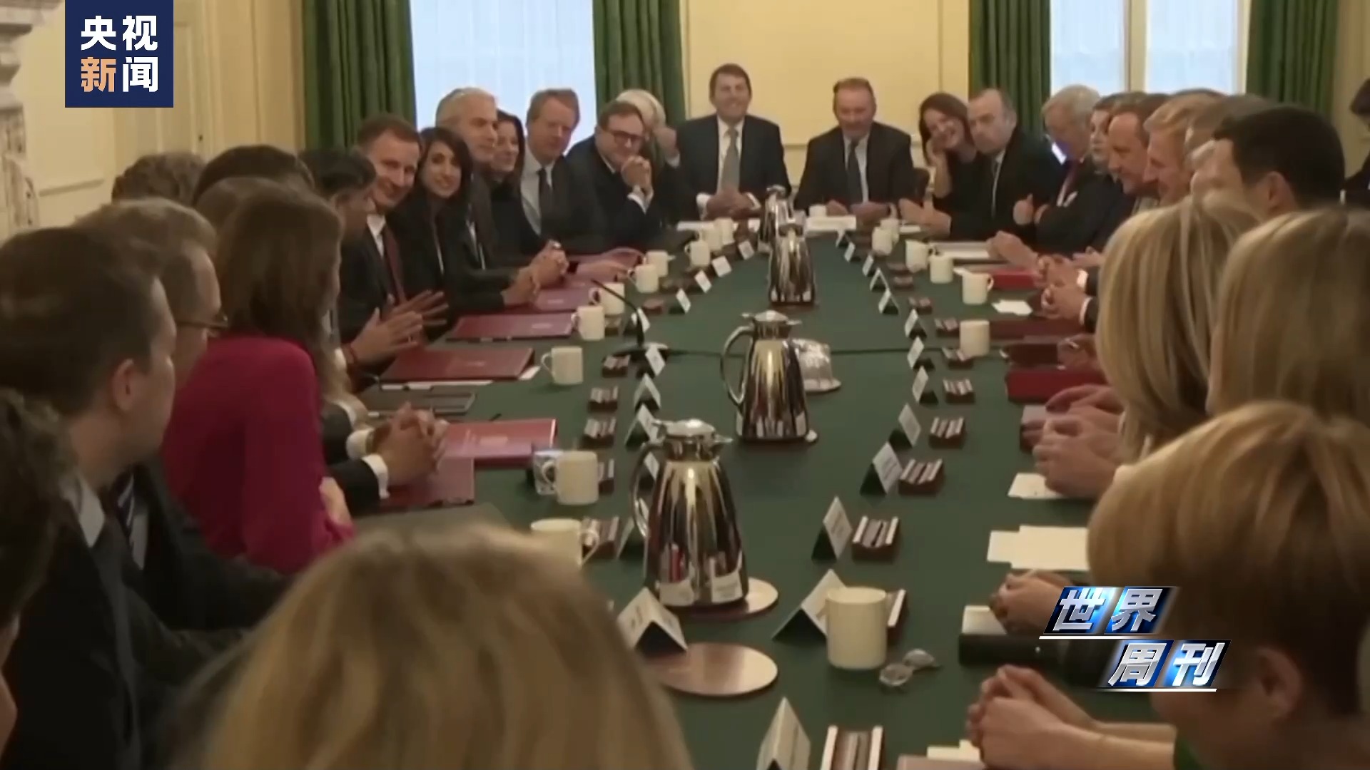 在新內(nèi)閣第一次會(huì)議上,卡梅倫坐在蘇納克的對(duì)面,兩人面帶笑容。