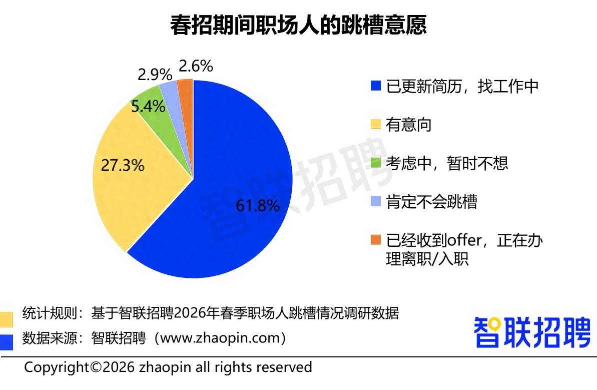 當(dāng)前正值“金三銀四”的求職高峰期,智聯(lián)招聘近期發(fā)布的《2026春季職場人跳槽情況調(diào)查報(bào)告》顯示,2025年僅三成職場人跳槽,2026年春招超九成職場人考慮跳槽,半數(shù)職場人愿意為了更輕松的工作降薪跳槽。