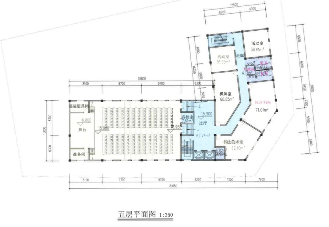 一層分布著辦證大廳、老年人日間照料室、非遺民俗展示廳、書畫作品展示廳等;二層主要用于社區(qū)辦公室;三層分布有社區(qū)文化、體育健身等公共服務(wù)設(shè)施;四層是社區(qū)圖書館;五層有一個(gè)大約能容納180人的室內(nèi)小劇場(chǎng)、書法美術(shù)室、棋牌室等。