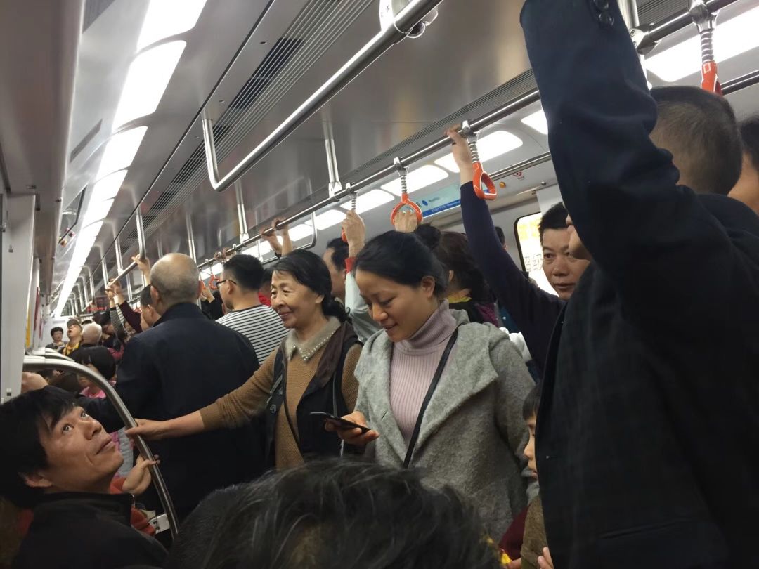 今天是周末,專程前來乘坐地鐵1號線的市民真不少,大家可以看到座位都已經(jīng)坐滿了,但是車廂空間足夠大,并沒有感到擁擠,而且列車運行速度在每小時34公里左右,車廂內(nèi)還是比較平穩(wěn)舒適。