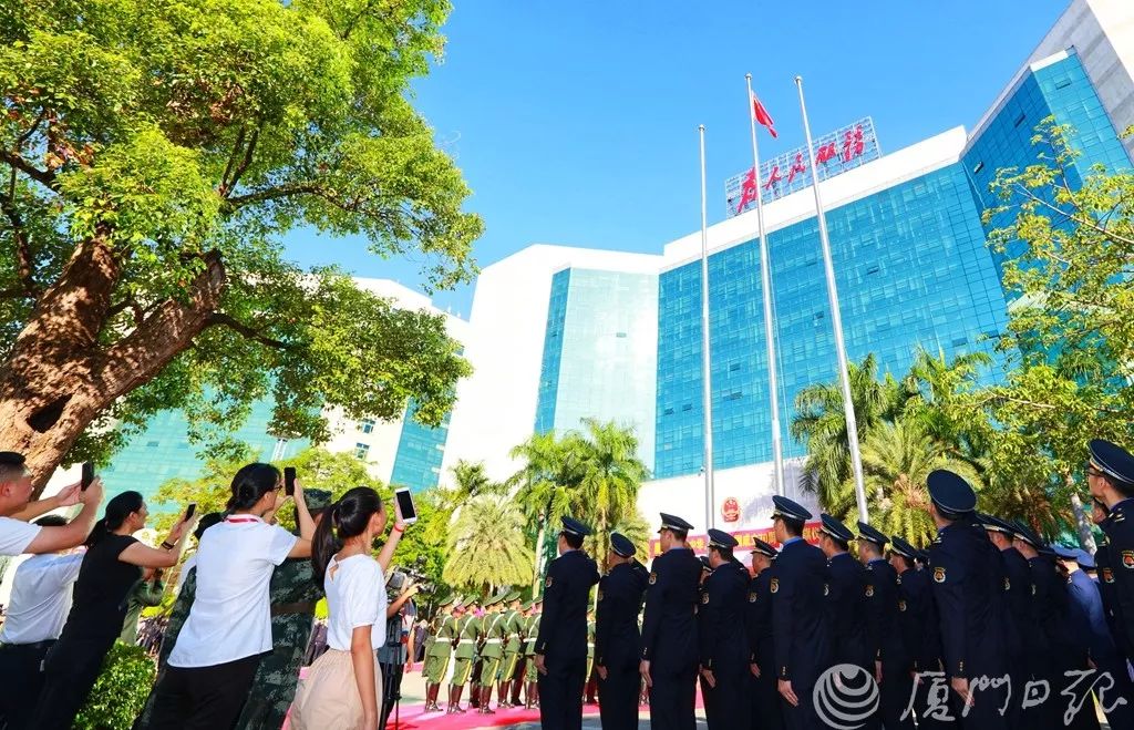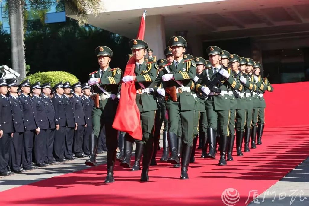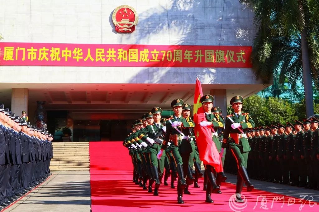 市領(lǐng)導、各界代表及自發(fā)前來的市民們?nèi)w肅立,駐廈部隊官兵代表行軍禮,人民警察代表行警禮,各界人士和群眾行注目禮。大家齊聲高唱國歌,注視著鮮艷的五星紅旗,冉冉升至旗桿頂端,迎風飄揚。
