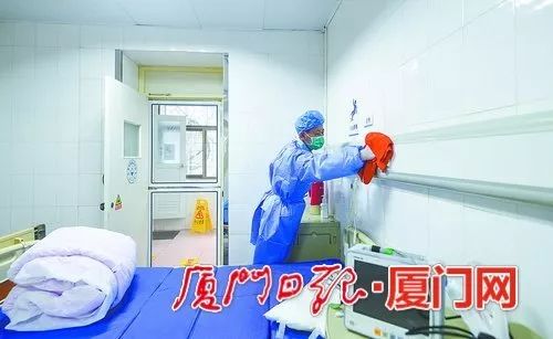 單間隔離的發(fā)熱觀察室,這間觀察室的病人已經(jīng)出院,醫(yī)院工作人員在病房內(nèi)進行清洗作業(yè)。廈門日報社全媒體記者林銘鴻攝
