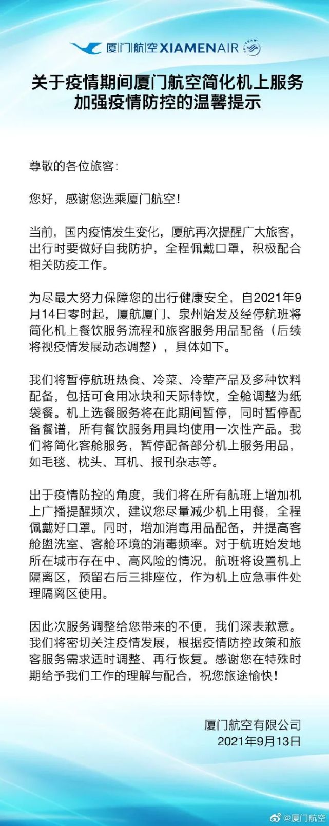 受疫情影響,廈航將從2021年9月14日零時起,簡化廈門、泉州始發(fā)及經(jīng)停航班的機(jī)上餐飲服務(wù)流程和旅客服務(wù)用品配備,后續(xù)將根據(jù)疫情發(fā)展動態(tài)調(diào)整。