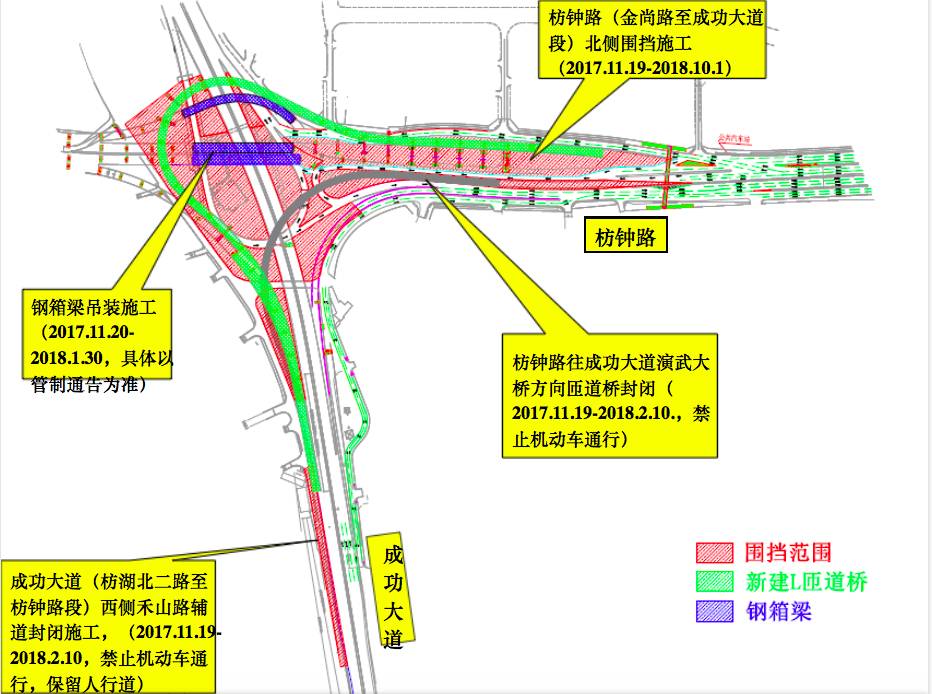 2017年11月20日至2018年1月30日,主線橋第6聯(lián)左右幅、H匝道橋第4聯(lián)鋼箱梁吊裝期間,成功大道主線雙向、枋鐘路出島方向、成功大道左轉(zhuǎn)枋鐘路匝道夜間各臨時(shí)封閉2~3晚(具體以管制通告為準(zhǔn))。