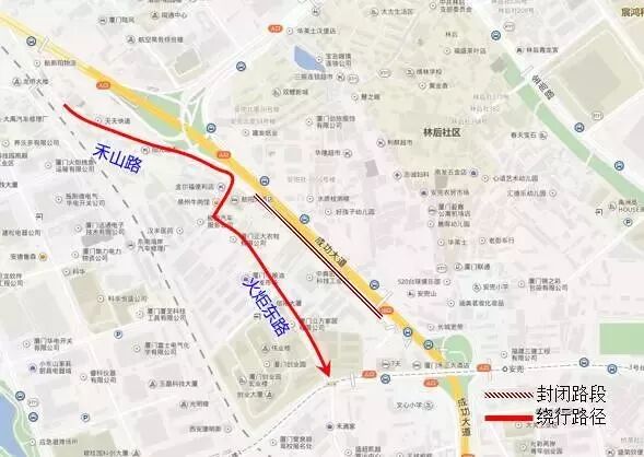 機(jī)動(dòng)車(chē)可通過(guò)枋鐘路-金尚路繞行或禾山路-火炬東路-火炬路繞行。
