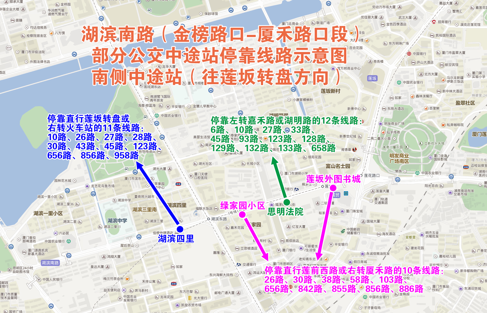 ?、僦毙猩徢拔髀坊蛴肄D(zhuǎn)廈禾路的26路、30路、38路、58路、103路、656路、842路、855路、856路、886路等10條線路,???ldquo;綠家園小區(qū)”站和新設(shè)的“蓮坂外圖書(shū)城”站。