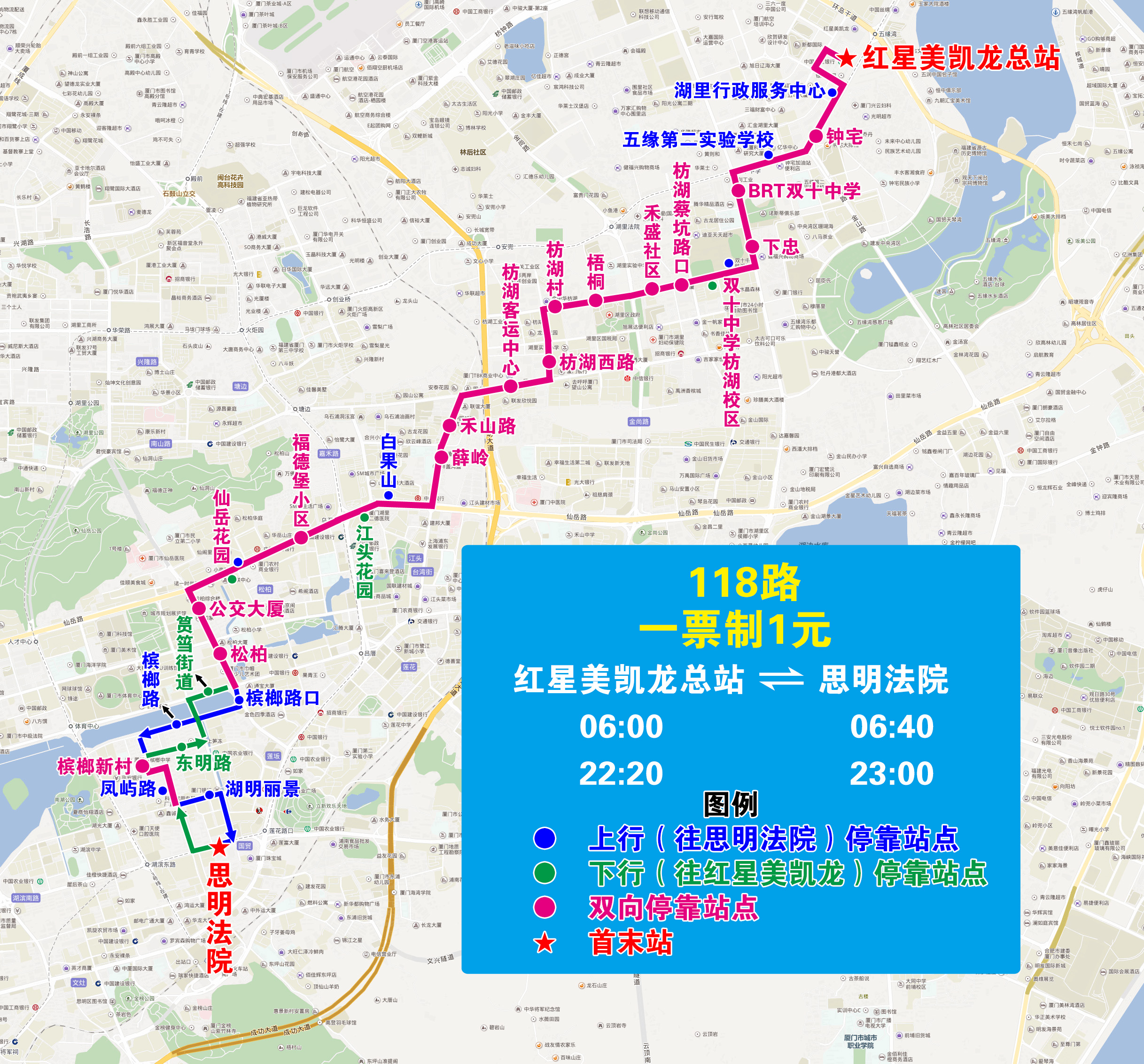 下行:思明法院始發(fā),經(jīng)湖濱南路、鳳嶼路、安平路接原線路往紅星美凱龍總站。