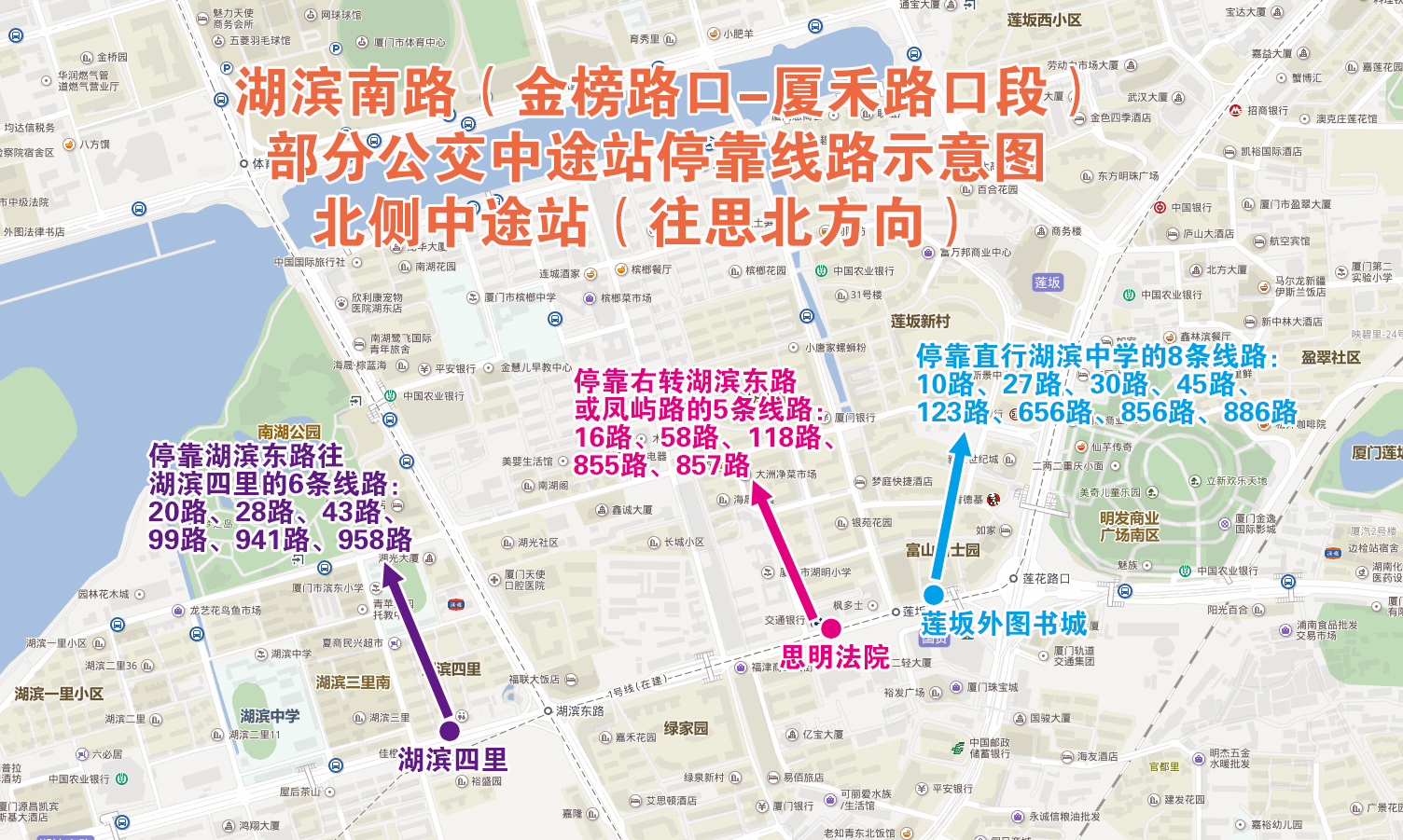 ②右轉(zhuǎn)湖濱東路、鳳嶼路的16路、58路、118路、855路、857路等5條線路,??窟w移后的“思明法院”站。