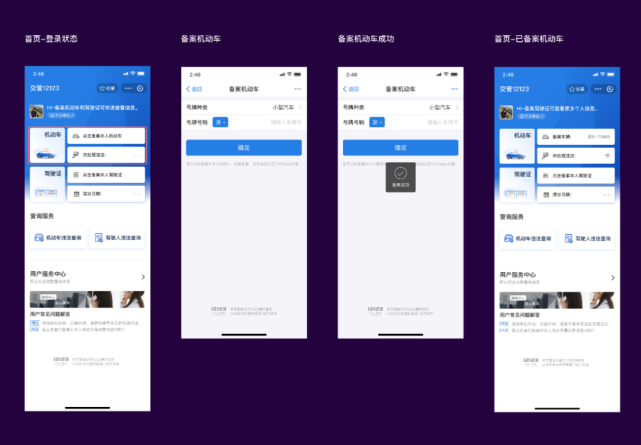 對于用戶未備案機動車的,用戶點擊首頁機動車區(qū)域或者用戶在機動車信息頁面點擊“備案更多機動車”,進入備案機動車服務功能。用戶選擇號牌種類,錄入號牌號碼后即可完成備案操作。▼