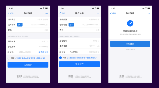 ■ 對未注冊“交管12123”用戶賬號的用戶,進入“交管12123”支付寶小程序后,點擊首頁上方的“請完善個人信息”,進入用戶注冊流程。用戶選擇駕駛證核發(fā)地或者機動車登記地作為注冊城市,填寫短信驗證碼完成注冊。