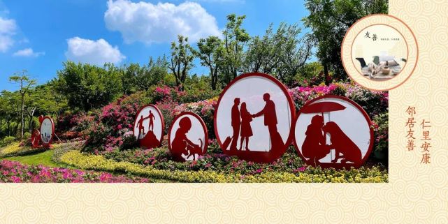 以“友善”為主題,用茶壺剪影及“以茶會友”的圖片體現(xiàn)閩南茶文化,并展示閩南待客的獨特風韻;又以鄰里和睦、親朋互助、人與動物友好相處的友善場景繪制剪影小品,體現(xiàn)友善迎人接物的處世態(tài)度。
