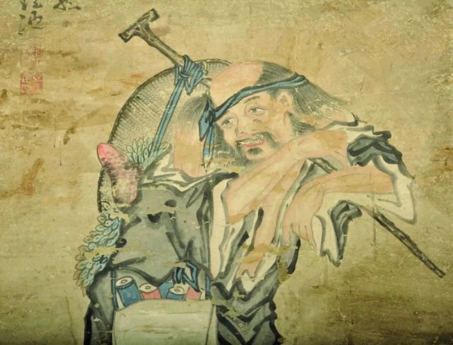 此中堂所畫人物為鐵拐李仙人。畫中仙人蓬頭垢面,身背一斗笠,肩上扛一杖,杖上系一袋,袋中裝有草藥與醫(yī)書,有著色。此仙神態(tài)笑容可掬,似佇立回眸。粗筆寫意,衣紋頓挫,線條硬朗,落墨沉著渾厚,有野逸之氣,與黃慎繪畫風(fēng)格相似。此畫左上有行書款:“□作此畫樂(lè)陶然,古松沈瑤池”。鈐二印,印已蛀損。
