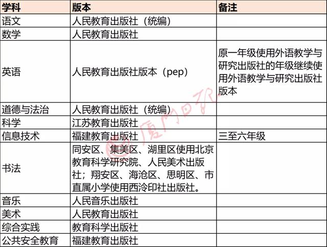 廈門市各中小學(xué)學(xué)科教材使用版本